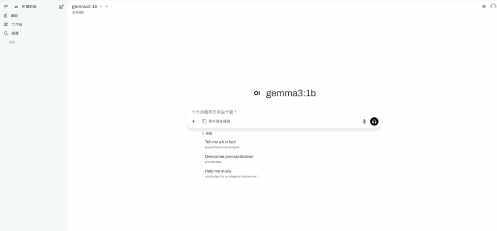 可以看到上方有個gemm3:1b模型,這就是從後端Ollama下載的模型,對後端模型的變更都會更新到Open-WebUI 介面。