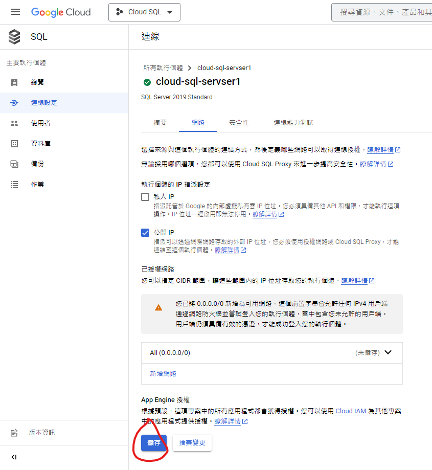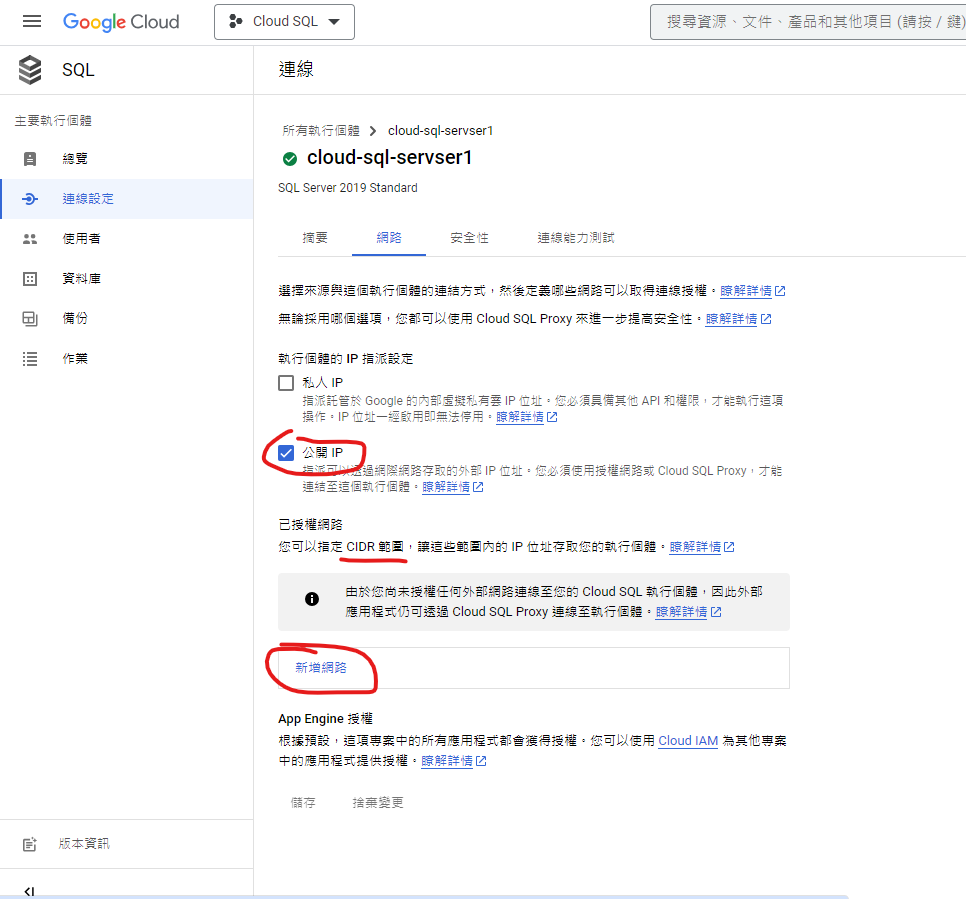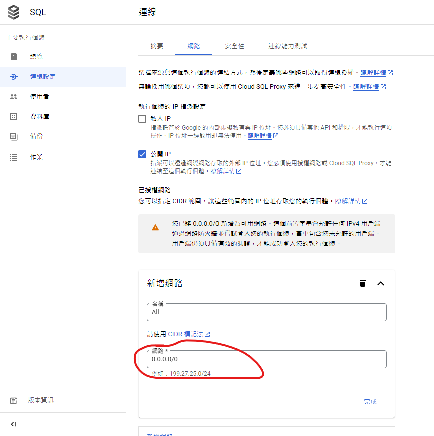 9. 在”連線設定”的”網路”設定中請勾選”公開IP”並點擊下方的”新增網路”,這裡的設定為限制那些外部IP可以存取該執行實體