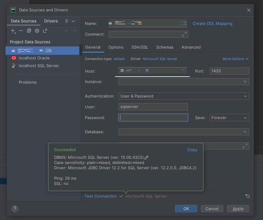 開啟DataGrip之後新增一個Data Source,這個Data Source就是用來連接剛剛建立的Cloud SQL實體,在Host填入執行實體的公開IP位址,Port輸入1433,帳號輸入sqlserver,密碼則是輸入執行實體的設定內容