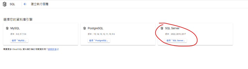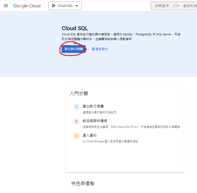 4. 在Cloud SQL畫面點擊”建立執行個體”