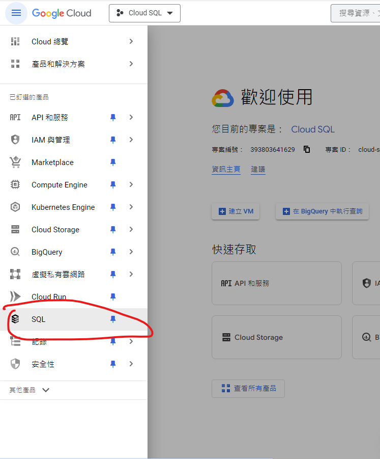 3. 點擊左側邊的”SQL”進入 Cloud SQL 畫面
