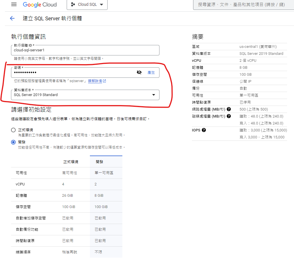 7. 這裡就是執行個體的設定項目,比較重要的有資料庫版本和密碼,其他部分依照不同需求設定,設定完成後點擊畫面最下方的”建立執行個體”